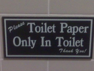 When I worked in an office building in Columbia, South Carolina, there was a sign in the 4th floor restroom that was not only hand written, but very hateful regarding the disposal of female sanitary products. I know people can be pigs, and cleaning up a public restroom can not be fun – but – I giggled every time I thought about the cleaning person who had one night just had it up to HERE with the mess and scribbled the threatening sign with a black marker. You know, like you did with your college roommates. (I remember writing one that said something along the lines of, “Please put dirty dishes in the DISHWASHER. IT CLEANS THEM, I DON’T.”)